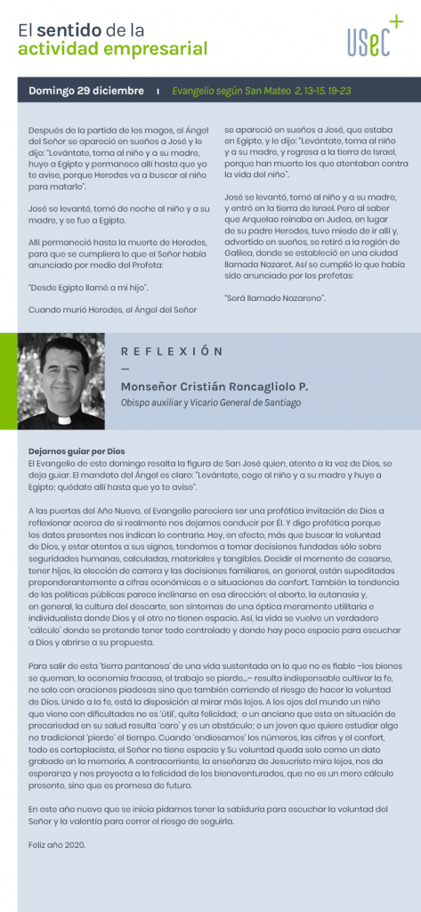 A las puertas del Año Nuevo, el Evangelio pareciera ser una profética invitación de Dios a reflexionar acerca de si realmente nos dejamos conducir por Él. Y digo profética porque los datos presentes nos indican lo contrario. Hoy, en efecto, más que buscar la voluntad de Dios, y estar atentos a sus signos, tendemos a tomar decisiones fundadas sólo sobre seguridades humanas, calculadas, materiales y tangibles. Decidir el momento de casarse, tener hijos, la elección de carrera y las decisiones familiares, en general, están supeditadas preponderantemente a cifras económicas o a situaciones de confort. También la tendencia de las políticas públicas parece inclinarse en esa dirección: el aborto, la eutanasia y, en general, la cultura del descarte, son síntomas de una óptica meramente utilitaria e individualista donde Dios y el otro no tienen espacio. Así, la vida se vuelve un verdadero ‘cálculo’ donde se pretende tener todo controlado y donde hay poco espacio para escuchar a Dios y abrirse a su propuesta.