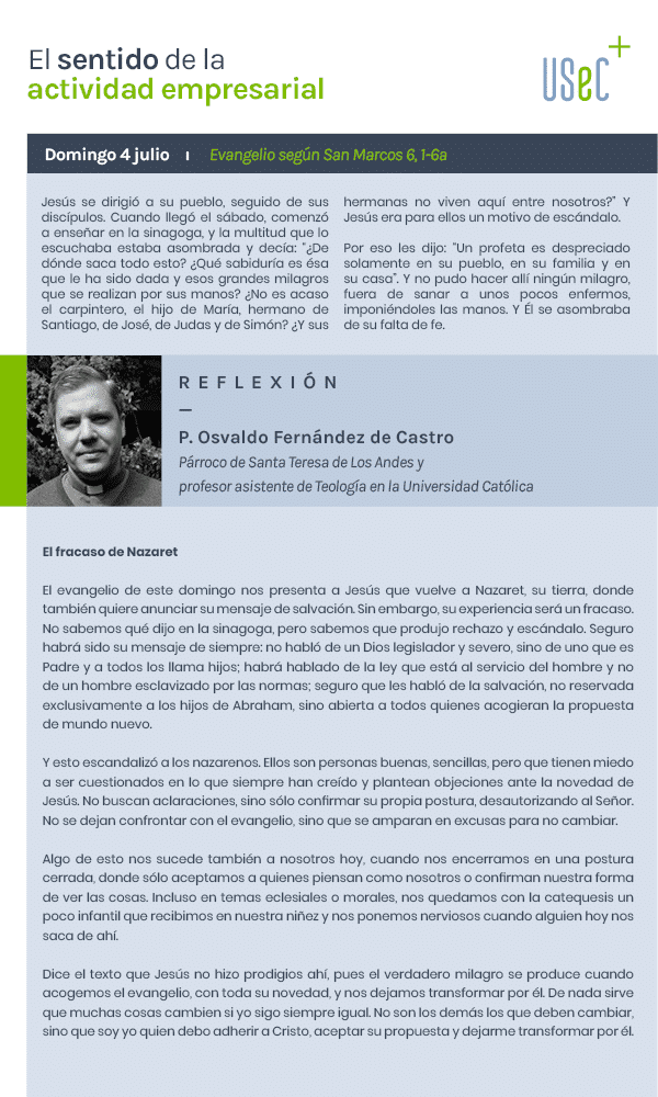 El evangelio de este domingo nos presenta a Jesús que vuelve a Nazaret, su tierra, donde también quiere anunciar su mensaje de salvación. Sin embargo, su experiencia será un fracaso. No sabemos qué dijo en la sinagoga, pero sabemos que produjo rechazo y escándalo. Seguro habrá sido su mensaje de siempre: no habló de un Dios legislador y severo, sino de uno que es Padre y a todos los llama hijos; habrá hablado de la ley que está al servicio del hombre y no de un hombre esclavizado por las normas; seguro que les habló de la salvación, no reservada exclusivamente a los hijos de Abraham, sino abierta a todos quienes acogieran la propuesta de mundo nuevo.