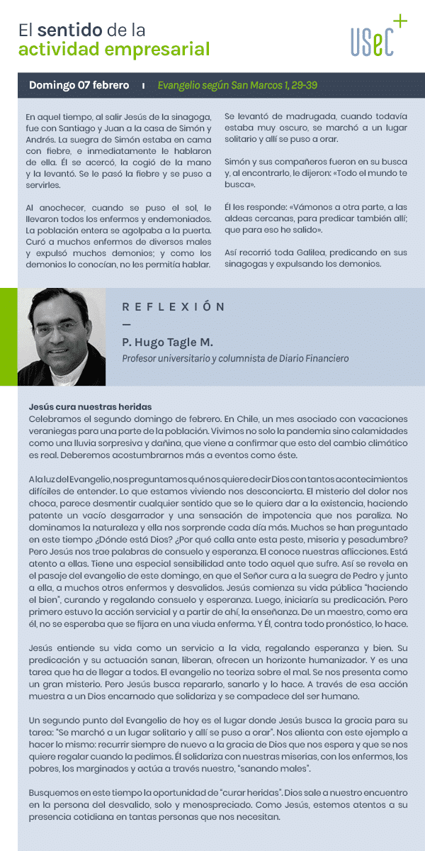Lo que estamos viviendo nos desconcierta. El misterio del dolor nos choca, parece desmentir cualquier sentido que se le quiera dar a la existencia, haciendo patente un vacío desgarrador y una sensación de impotencia que nos paraliza. No dominamos la naturaleza y ella nos sorprende cada día más. Muchos se han preguntado en este tiempo ¿Dónde está Dios? ¿Por qué calla ante esta peste, miseria y pesadumbre? Pero Jesús nos trae palabras de consuelo y esperanza. El conoce nuestras aflicciones. Está atento a ellas. Tiene una especial sensibilidad ante todo aquel que sufre. Así se revela en el pasaje del evangelio de este domingo, en que el Señor cura a la suegra de Pedro y junto a ella, a muchos otros enfermos y desvalidos. Jesús comienza su vida pública “haciendo el bien”, curando y regalando consuelo y esperanza. Luego, iniciaría su predicación. Pero primero estuvo la acción servicial y a partir de ahí, la enseñanza. De un maestro, como era Jesús, no se esperaba que se fijara en una viuda, mujer y enferma. Y Él, contra todo pronóstico, lo hace.