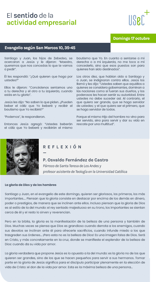 Santiago y Juan, en el evangelio de este domingo, quieren ser gloriosos, los primeros, los más importantes…. Piensan que la gloria consiste en destacar por encima de los demás en dinero, poder o prestigios, de manera que se inclinen ante ellos. Incluso piensan que la gloria de Dios es al estilo de la del mundo: el rey sentado majestuoso en su trono, los importantes se sientan cerca de él y el resto lo sirven y reverencian.