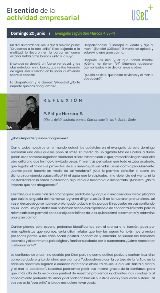 La confianza es el camino querido por Dios, pero no como actitud pasiva y conformista, sino como verdadero grito del alma que clama al Todopoderoso con la certeza de la fe. Solo en la crisis los apóstoles llegaron a conocer la potencia absoluta de Jesús, a quien “hasta el viento y el mar le obedecen”. Nosotros podríamos pedir esa misma gracia de la confianza, para que, más allá de la resolución puntual de nuestros problemas agobiantes, nos condujera al conocimiento profundo del amor y del poder de Dios en nuestras vidas y en nuestra historia. Tal vez esa es la “otra orilla” a la que nos quiere llevar Jesús.