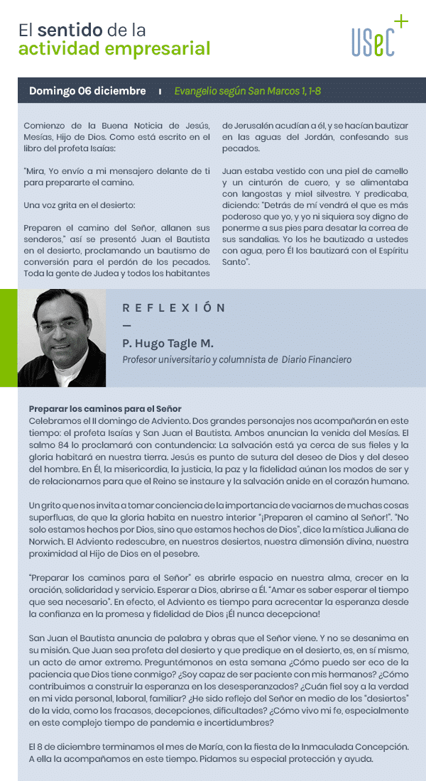 San Juan el Bautista anuncia de palabra y obras que el Señor viene. Y no se desanima en su misión. Que Juan sea profeta del desierto y que predique en el desierto, es, en sí mismo, un acto de amor extremo. Preguntémonos en esta semana ¿Cómo puedo ser eco de la paciencia que Dios tiene conmigo? ¿Soy capaz de ser paciente con mis hermanos? ¿Cómo contribuimos a construir la esperanza en los desesperanzados? ¿Cuán fiel soy a la verdad en mi vida personal, laboral, familiar? ¿He sido reflejo del Señor en medio de los “desiertos” de la vida, como los fracasos, decepciones, dificultades? ¿Cómo vivo mi fe, especialmente en este complejo tiempo de pandemia e incertidumbres?